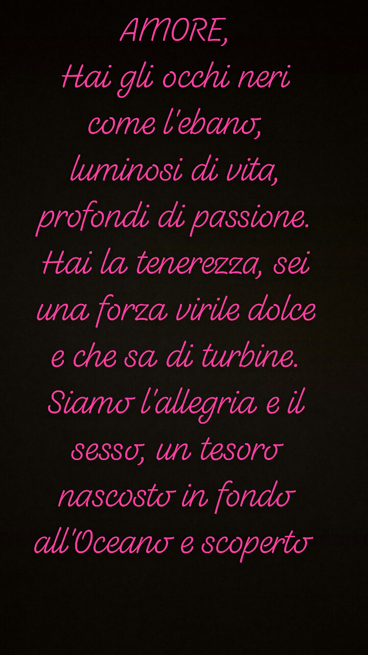 E Tenerezza e Passione, si unirono, in questo trepitio di emozioni, in un amplesso infinito, legati per sempre . finalmente . insieme . un'unica persona! E quella notte infinita nacque Amore, il loro frutto, l'essenza di entrambi, la perfezione! Tenerezza e Passione gli diedero la vita e . insieme percorsero mondi e solcarono mari e
