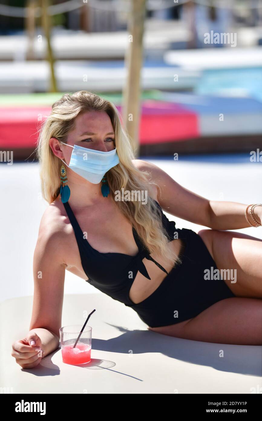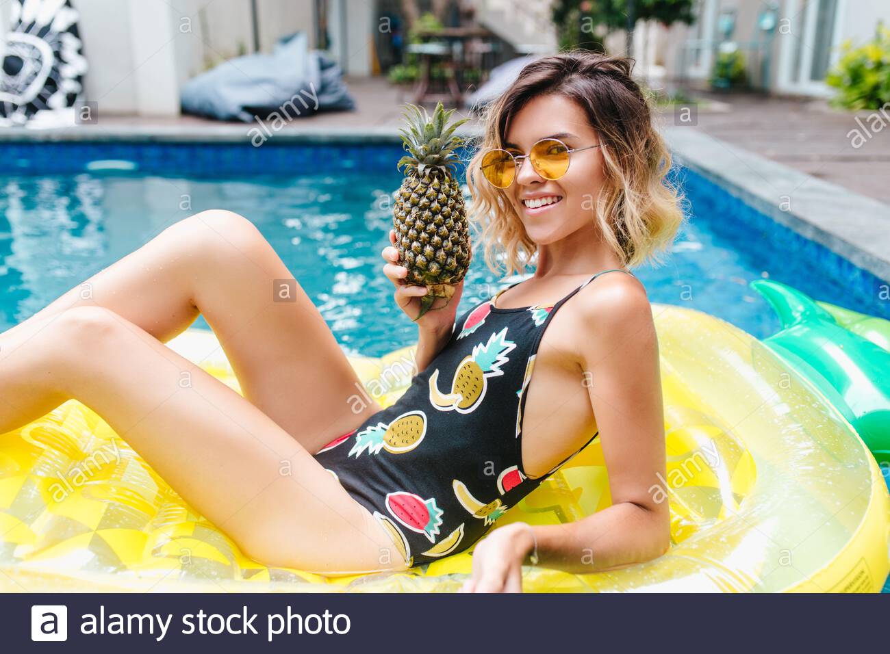 Una bionda che gode a bordo piscina