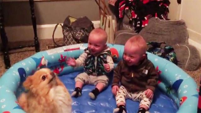 Mettono i due gemelli ed un cagnolino in una piscina gonfiabile e si divertono da matti! Questi due gemelli dimostrano quanto possa bastare poco per divertirsi da matti in modo sano e senza tanti giocattoli . Le loro risate sono davvero contagiose .