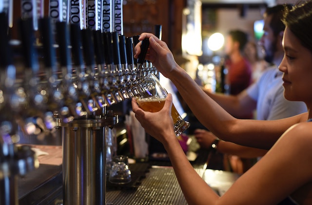 Une serveuse et un client seul dans un bar