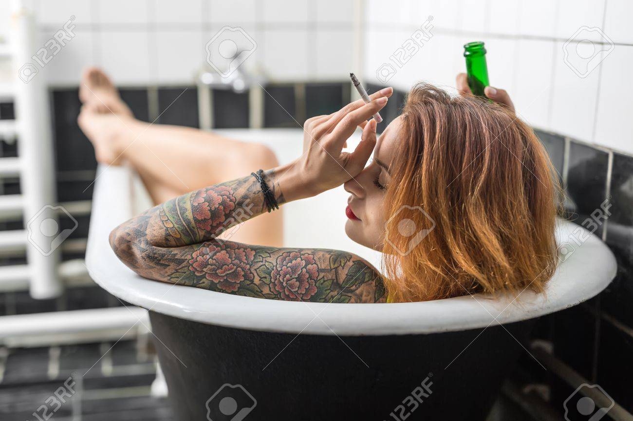 Salope blonde tatouée baisée sur le canapé