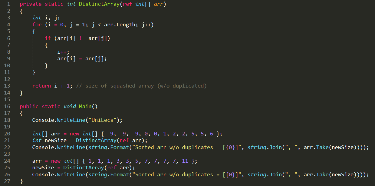 - Проверяем: если arr[i] != arr[j], то увеличиваем счетчик i на единицу и записываем новый элемент в i: arr[i] = arr[j]. Если элементы равны, то ничего не делаем.