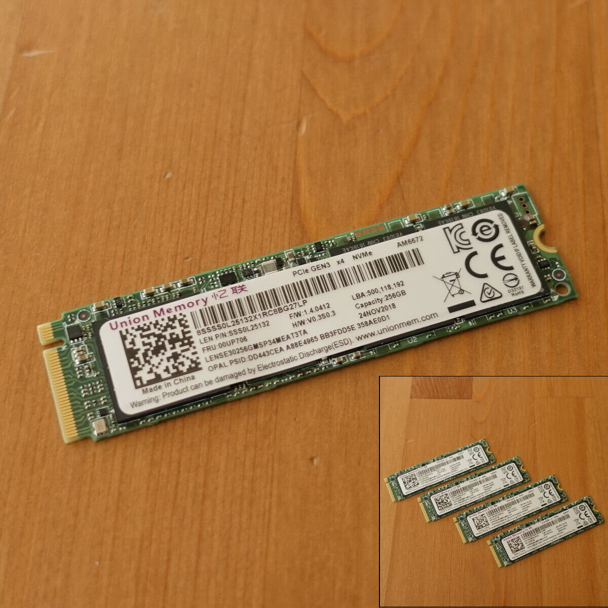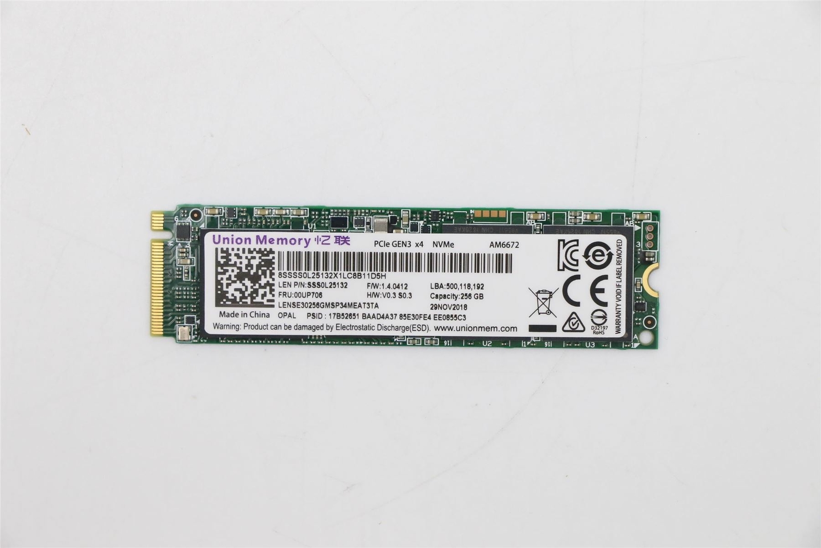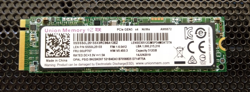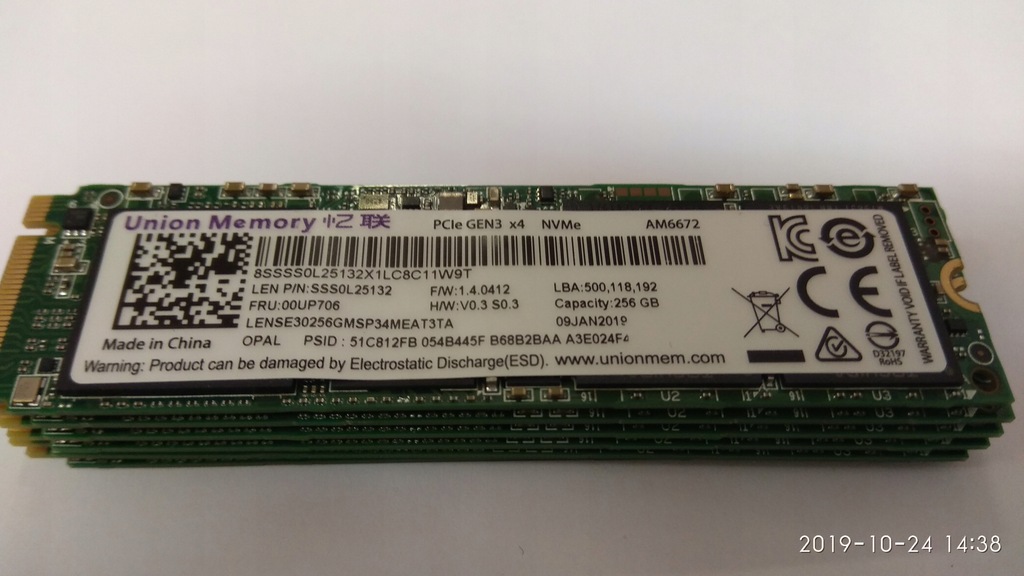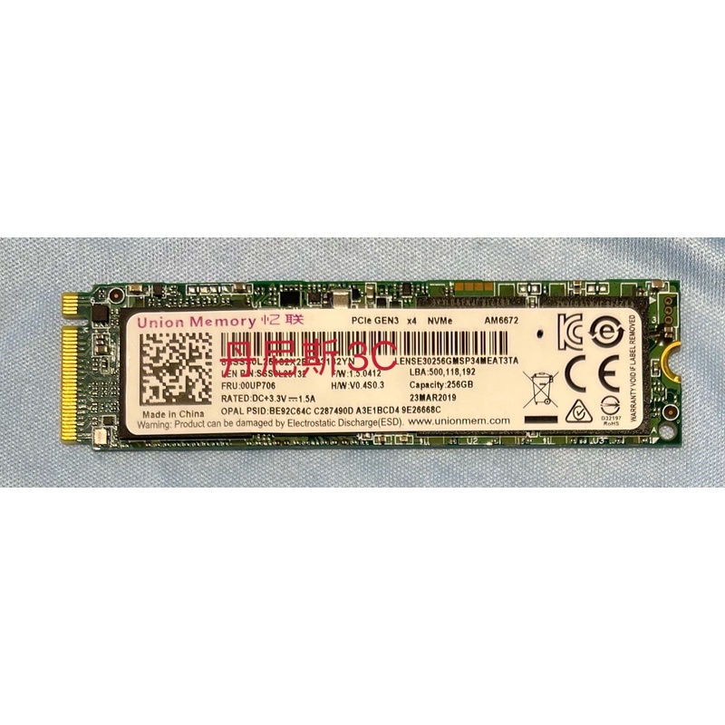 Lenovo Union Memory 256 GB M .2 2280 NVMe M-Key AM6672 20 JUN 2019 - PCIe GEN3 x4 8SSSS0L25132X3LC9611SV4 LENSE30256GMSP34MEAT3TA LEN P/N: SSS0L25132 F/W: 1 .6 .0412 LBA: 500,118,192 FRU: 00UP706 H/W . . .