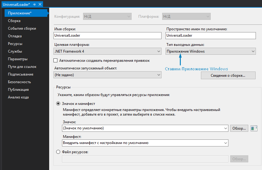 И поставить: Тип выходных данных за место консольного приложения на приложение Windows как показано на скриншоте выше.