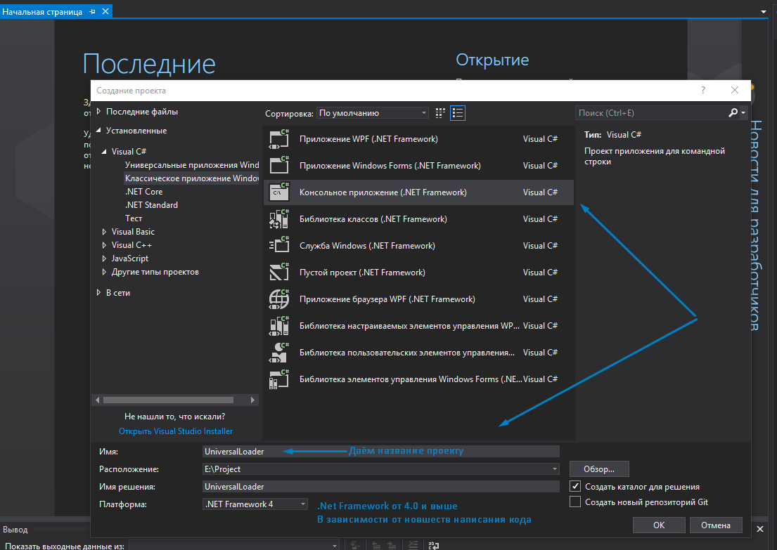 Для начала создадим консольный проект и дадим ему любое название: