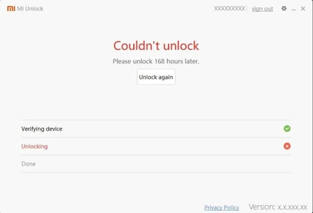 ( On your first attempt, Mi Unlock will show the message "Couldn’t unlock. Please unlock 168 hours later." Follow the timer / waiting period to unlock successfully.