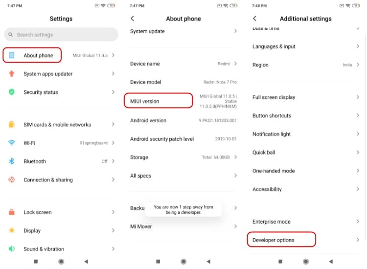 Tap on Miui version 7-8 times to see the pop-up saying: "you are now a developer!"