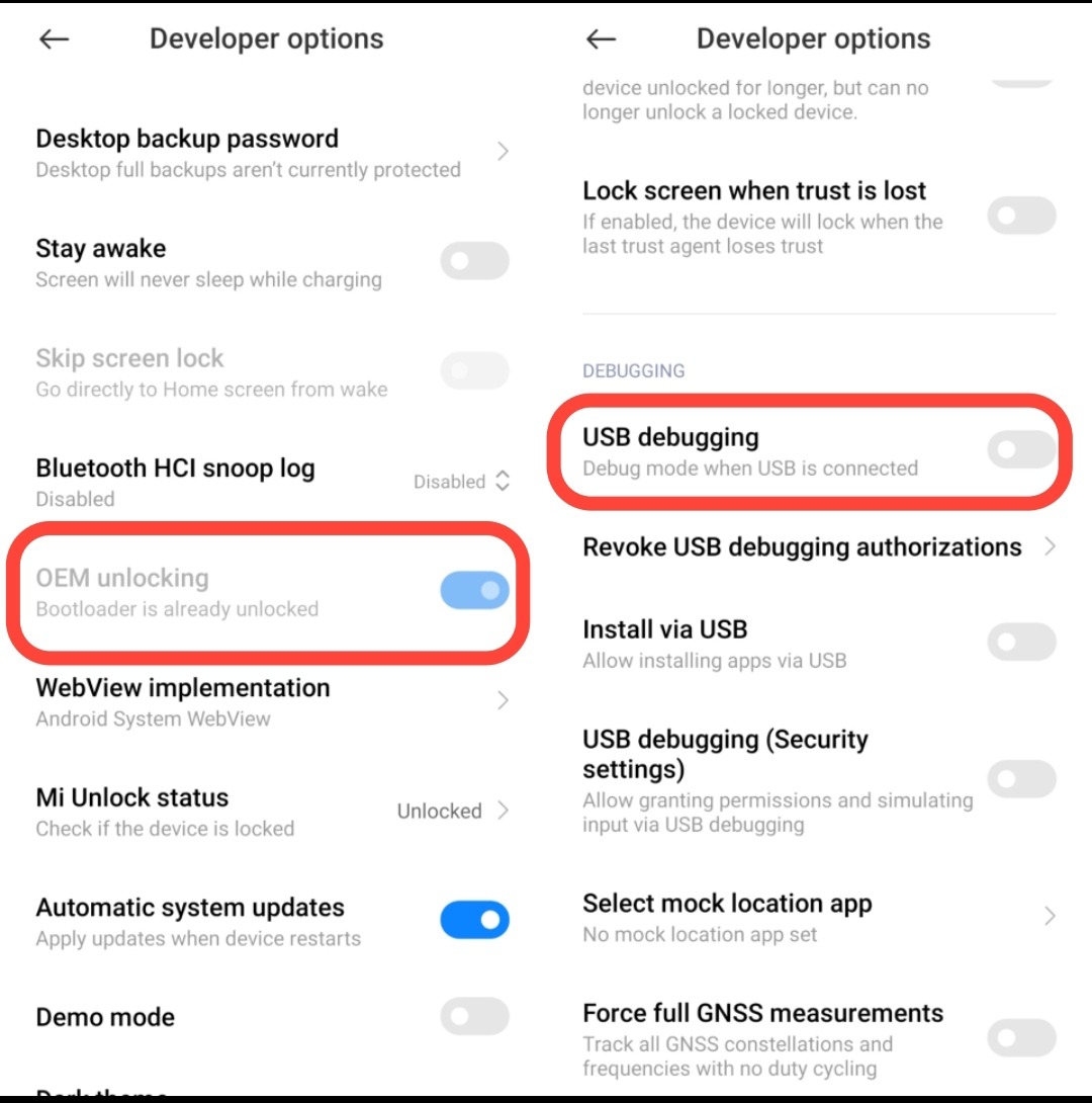 Here enable, 2 options named "OEM unlocking" and "Usb debugging" .