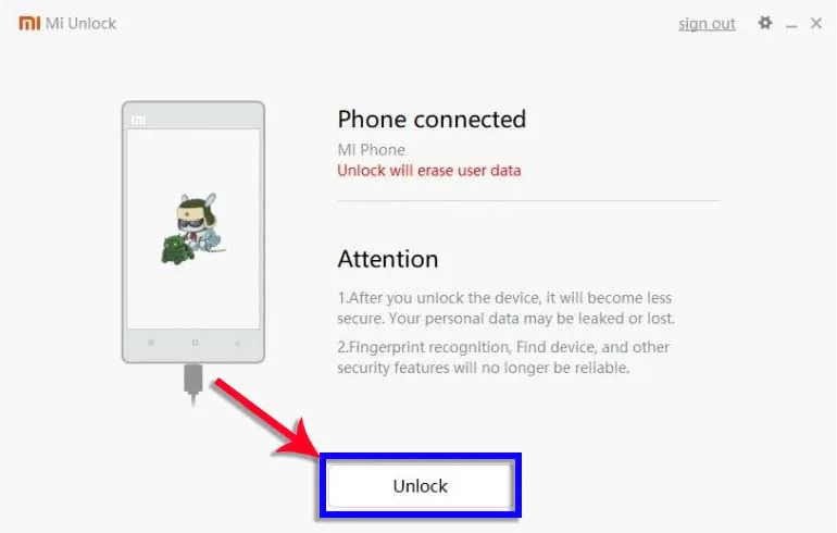 Once the waiting period is over, use Mi Unlock and click on Unlock, It will unlock the bootloader of your phone.)