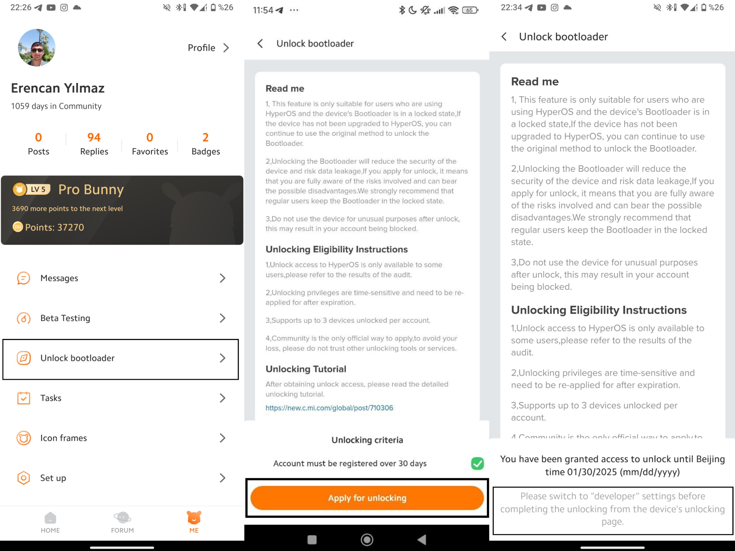 1- login to your Mi account ( the older account is better chance to bypass waiting time - Maximum three devices can be unlocked in a year with one user account)