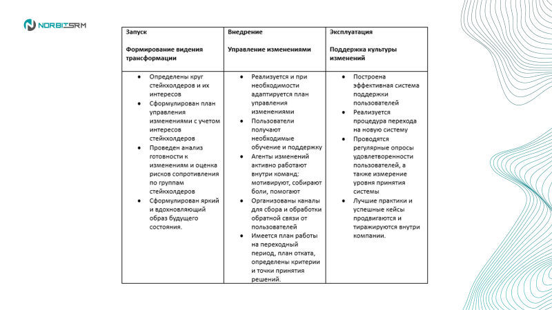 - Ключевые задачи: донести суть изменений («Что?»), сформировать понимание ценности («Зачем?») и обучить («Как?»)