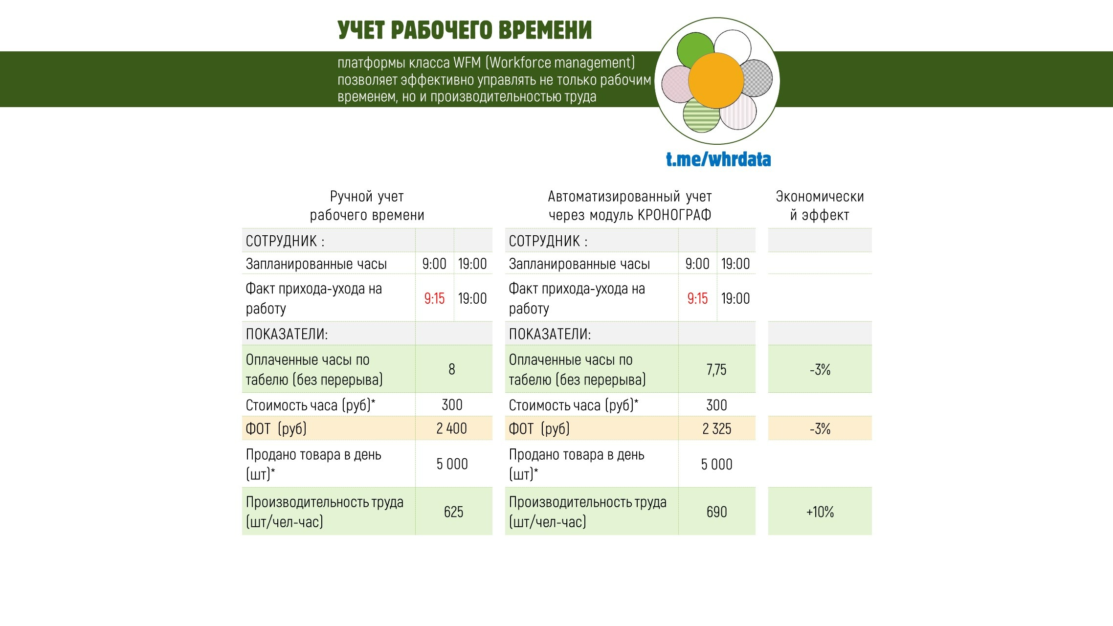 За счет усиления дисциплины персонала. Если до внедрения модуля учета сотрудники могли опаздывать или раньше уходить с работы и это оставалось незамеченным и влияло на экономику предприятия, то внедрив простой инструмент контроля вы получаете потрясающий эффект.