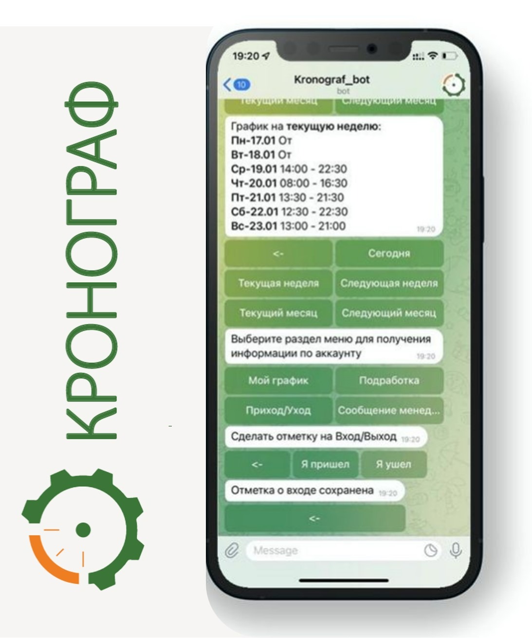 В КРОНОГРАФ используется альтернатива стационарным или мобильным биометрическим системам. Регистрации приходов/уходов персонала происходит в интеллектуальном телеграмм- боте. Приложение устанавливается на личные смартфоны сотрудников и не требует вложений в инфраструктуру.