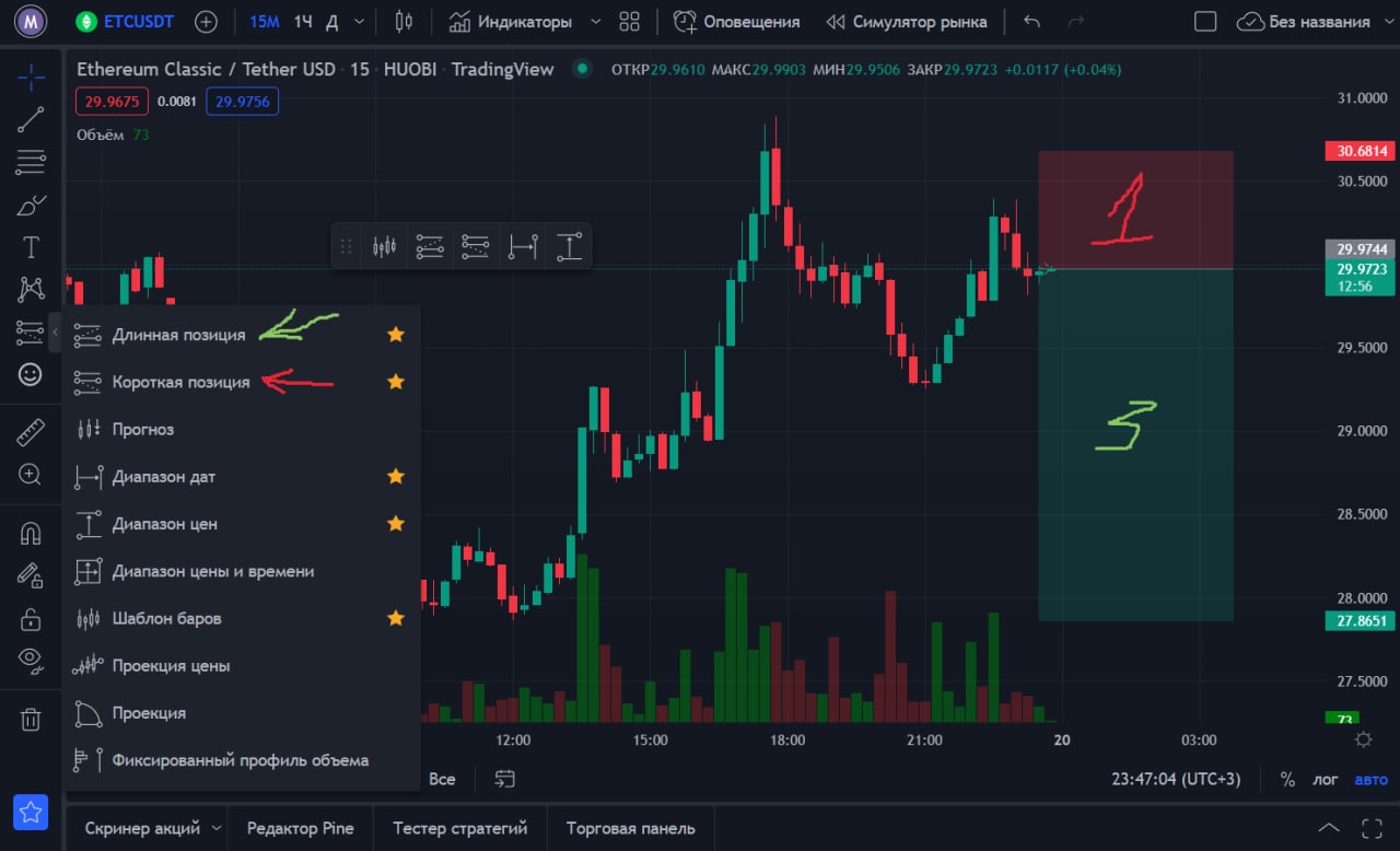 Теперь что нам нужно сделать: мы ищем предполагаемый Demand (зону поддержки) и вероятный Supply (зону сопротивления). Рассматривая шорт-позицию, мы используем инструмент “Короткая позиция” (лонг- длинная):