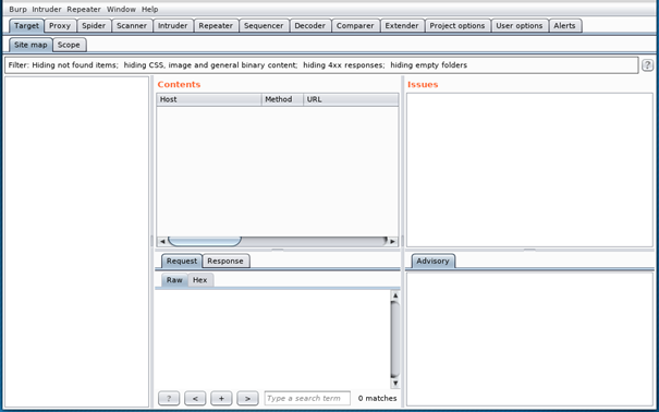 Ну что же Burp запущен. Я решил не делать описание всех инструментов и вкладок сразу, я буду делать это по ходу уроков.