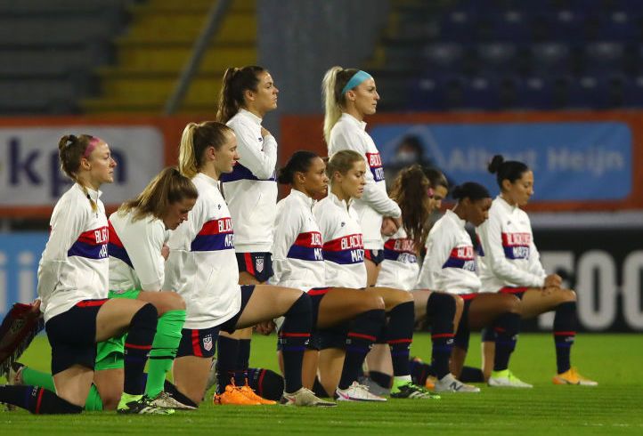 Total disgrace if not for men like the veteran they be speaking German .but this is just another display of how the Democrats controlled mainstream news media and leftist Marxist communist school teachers have brainwashed idiots like this kick them out the game most will be out the team soon anyway when the next wave of trasgender men join the women team.