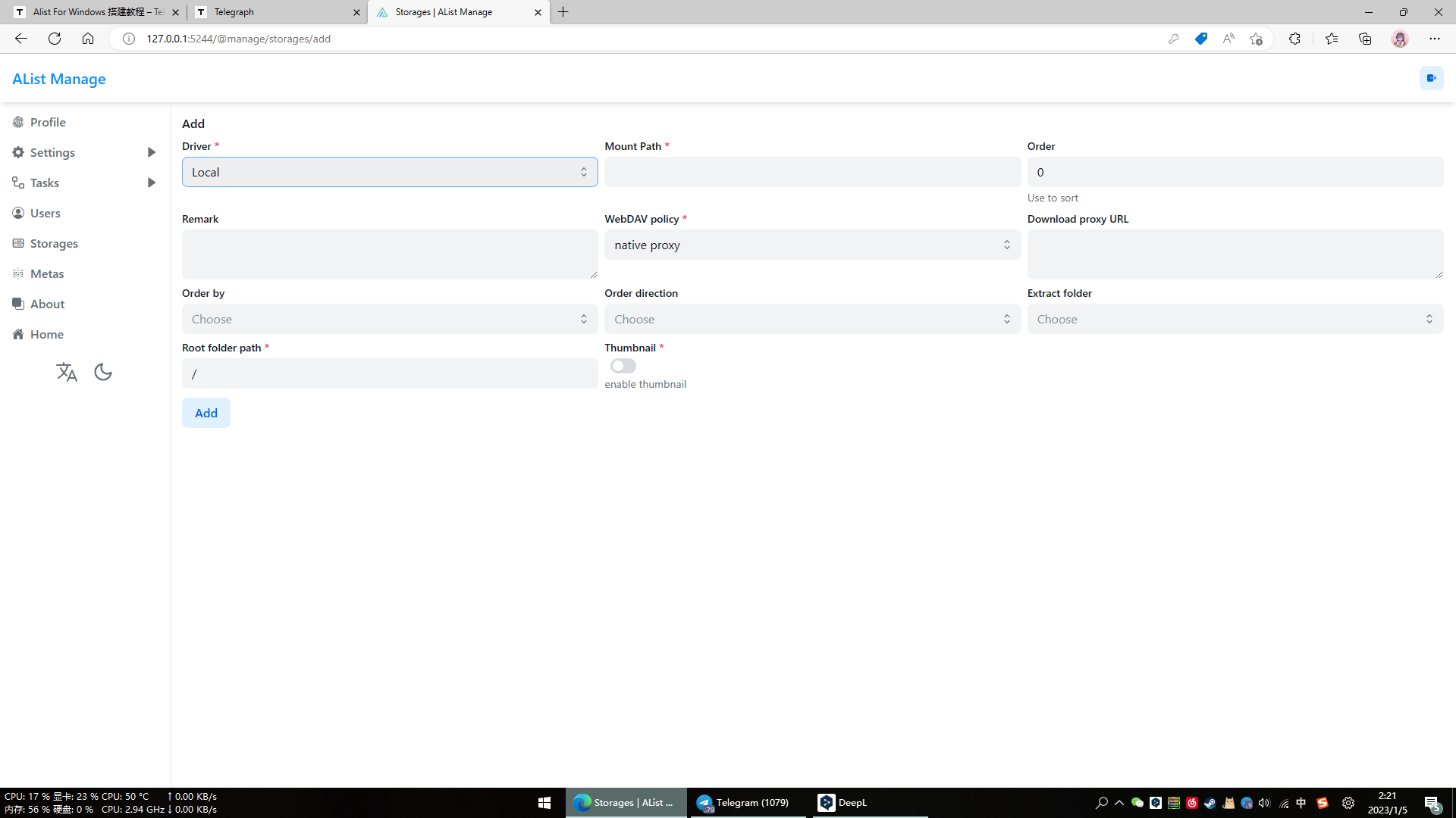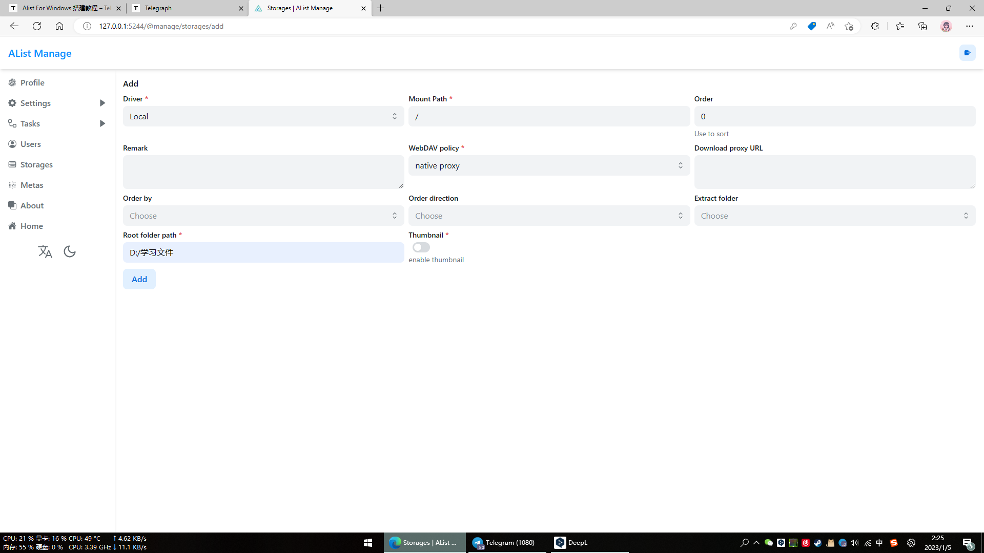Root folder path:This refers to the location of the files on your computer. After you enter it correctly, you will see the contents of the folder you chose to mount on your computer in the alist
