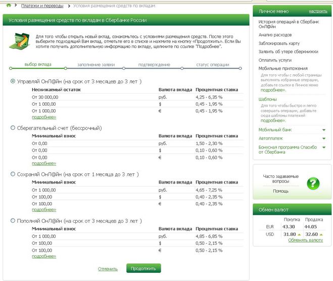 Условия размещения средств в банке