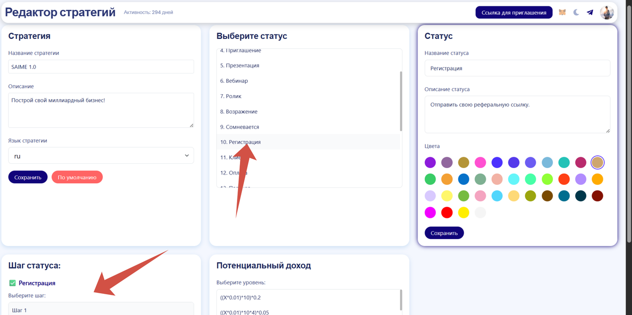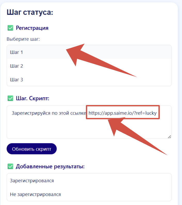 В "Статусах" выберите "10. Регистрация", далле нажмите на "Шаг 1" и вставьте в скрипт, скопированную ранее ссылку.