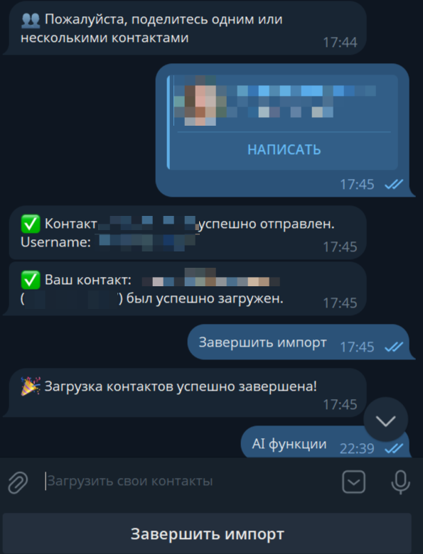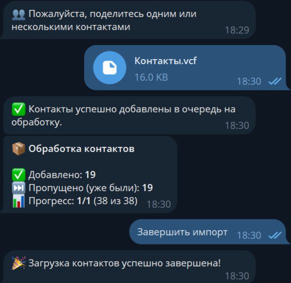 В ТГ Боте нажмите на кнопку "Импорт контактов".