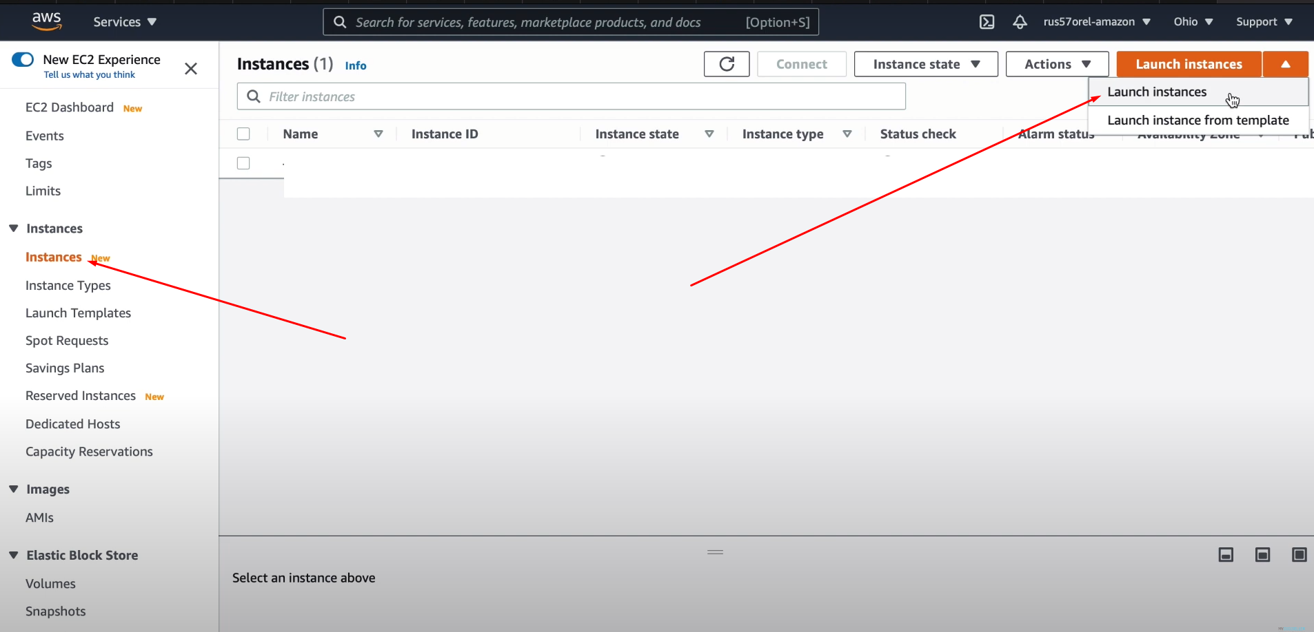 После создания ключей идем в раздел Инстанция - Launch Instance