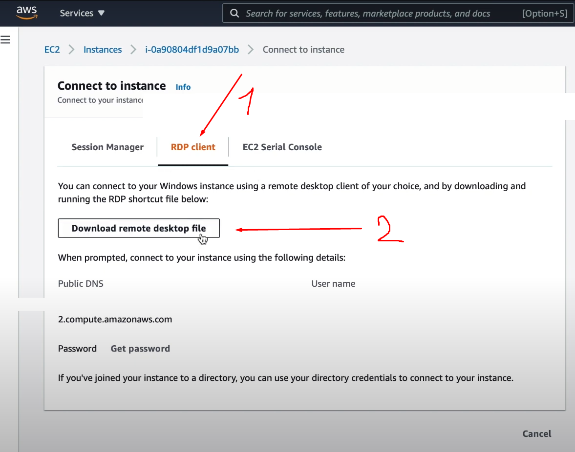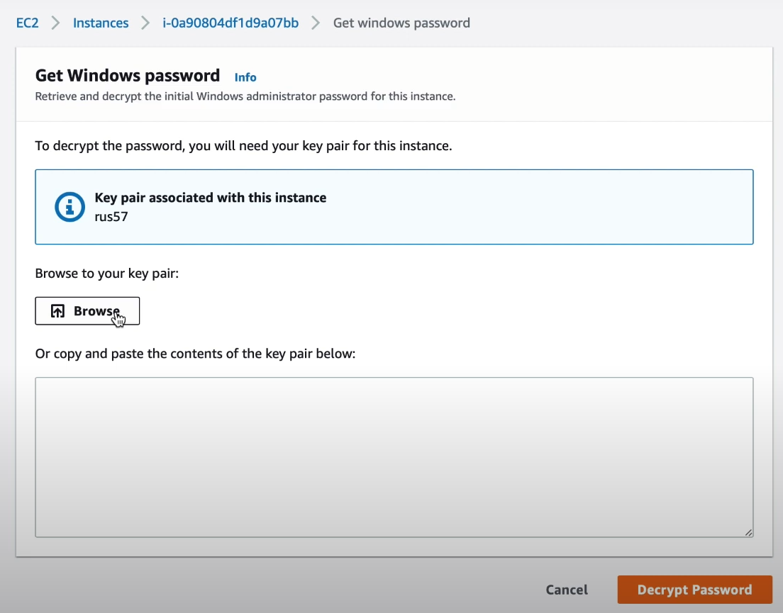 Для отображения пароля вам потребуется загрузить файл key pair *pem, дабы отобразился пароль.