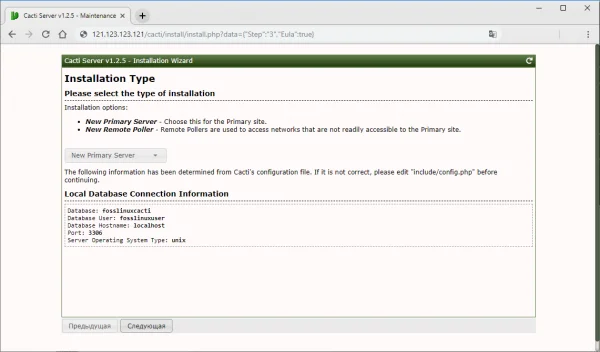Отредактируйте файл конфигурации Cacti, указав базу данных, пароль, пользователя и пр.: