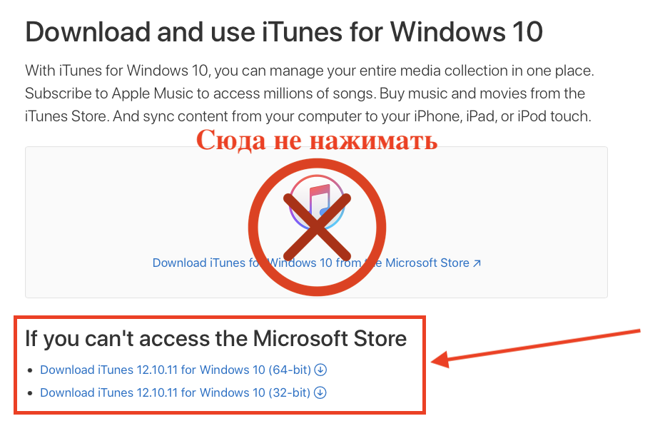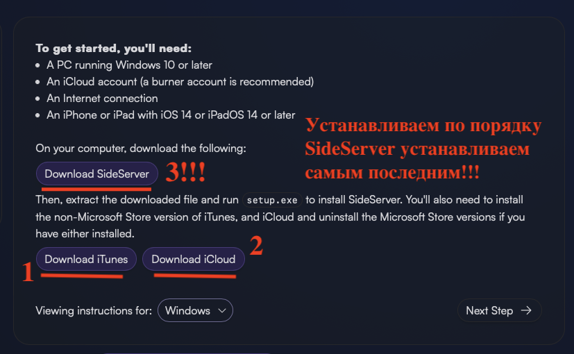 На скриншоте выше показан процесс установки. Это сделано для удобства. Ставим в таком порядке iTunes -> iCloud -> SideServer. Первым делом мы устанавливаем iTunes, тут ОЧЕНЬ ВАЖНО установить именно отдельную Windows версию, НЕ приложение из Microsoft Store!!! Ссылки на отдельное приложение находятся НИЖЕ основной ссылки ведущей на Microsoft Store.