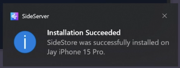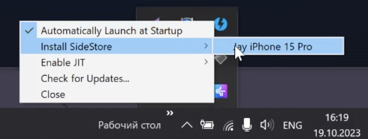 После всех манипуляций при подключенном iPhone/iPad к компьютеру по проводу при клике на SideServer внизу в трее и выборе пункта “Insall SideStore” в выпадающем меню должно быть показано ваше устройство.