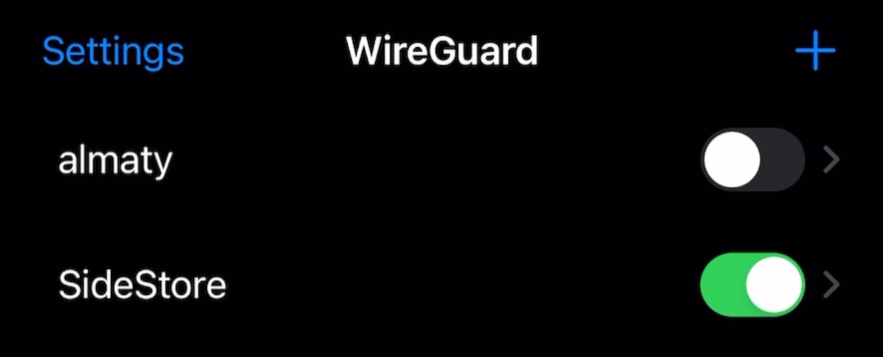Теперь в WireGuard переключаем тумблер напротив «SideStore», он должен загореться зеленым цветом.