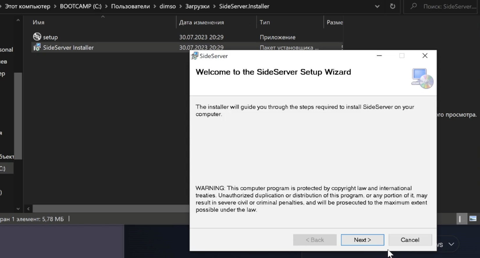 Теперь качаем SideServer, он скачивается в виде архива. Распаковываем его и запускаем SideServer Installer. Соглашаемся на все условия и устанавливаем. Возможно вам понадобиться запустить его от имени администратора.