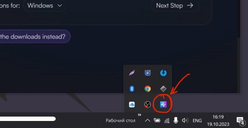 После установки SideServer не появляется нигде на экране отдельным окном, он находится внизу в трее маленьких иконок приложений, она выглядит как переливающийся сине-фиолетовый квадрат. Она выделена на скриншоте.