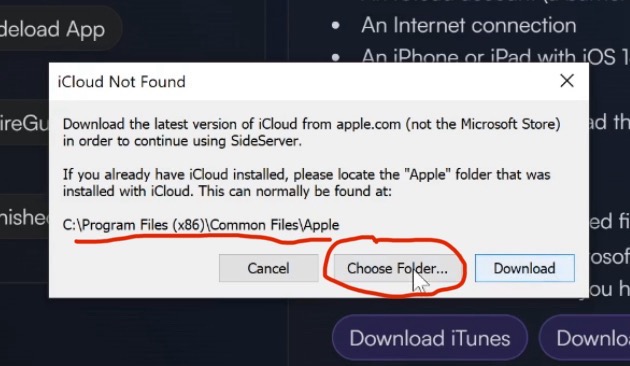 У вас также при установке может попросить указать где установлен iCloud. В таком случае нажмите на среднюю кнопку «Select Folder» и вручную выберите нужную папку (Apple). Какая конкретно папка нужна указано на последней строке сообщения, я ее подчеркнул.