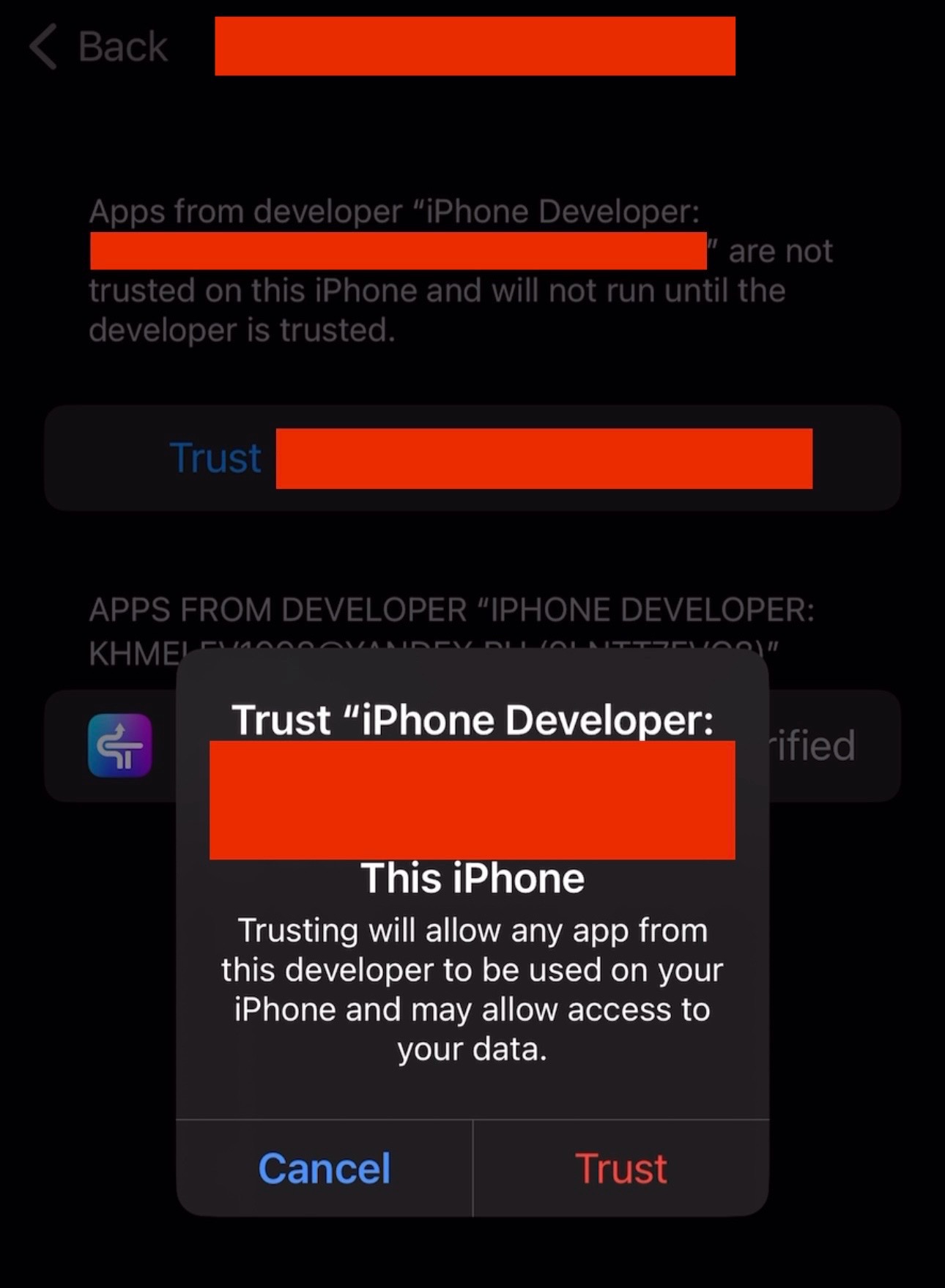 Теперь при попытке открыть SideStore нам выдаст сообщение, что приложение «от неизвестного разработчика».