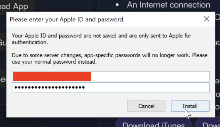 Нажимаем на имя нашего устройства. Нас попросят уже в третий раз ввести свой AppleID. Вводим логин и пароль и нажимаем «Install». Да, это безопасно.