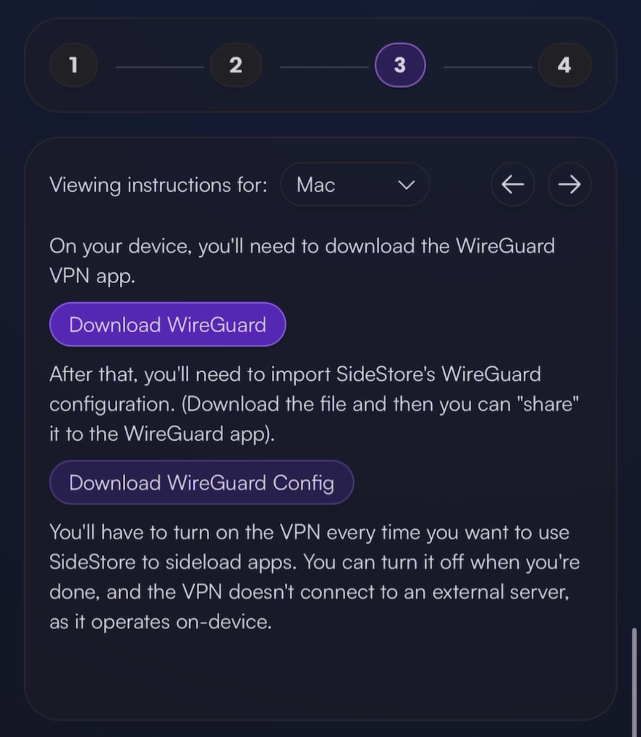 Опять возвращаемся на сайт с гайдом в 3 этап и теперь уже качаем WireGuard Config. Теперь нам нужно его загрузить в сам WireGuard, сделать это можно разными способами. Один из них это: открыть WireGuard и нажать на «+» в самом верху экрана справа и выбрать пункт «Создание из файла или архива». Выбираем файл под названием «SideStore», у него должна дать иконка WireGuard (дракон на красном фоне).