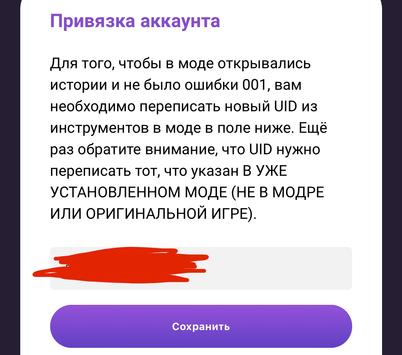 После этого нужно вставить в поле со старым UID свой новый UID и нажать «Сохранить»