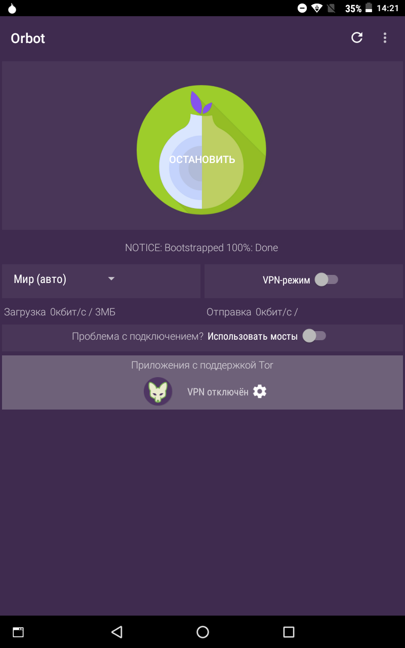 Затем запускаем орбот и ждем когда он полностью забутстрапиться (будет написано Bootstrap 100% под луковицей).