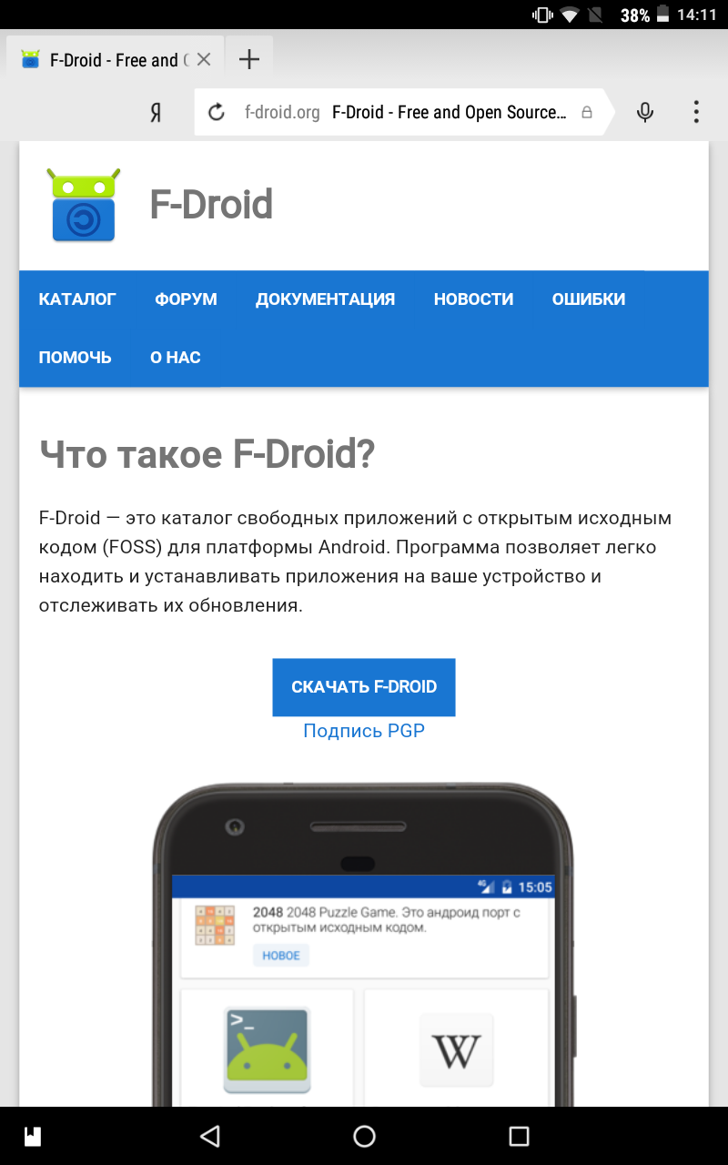 Я не доверяю гугловским приложениям. И вам не советую. Так что скачивать все будем с f-droid. Идем на сайд f-droid.org, видим большую кнопку скачать - тапаем на нее. Скачиваем apk файл.