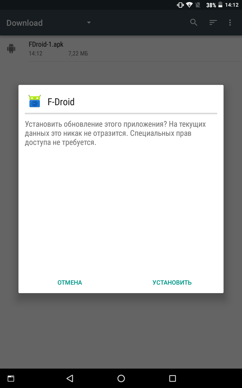 Затем открываем проводник и находим в папке Загрузки (Downloads) наш скачанный файл fdroid.apk. Тапаем на него и устанавливаем f-droid. Это аналог Гугл Плей Маркета, только там не нужно регистрироваться, а все приложения с открытым кодом - так что они точно не шпионят и не имеют каких то скрытых функций.