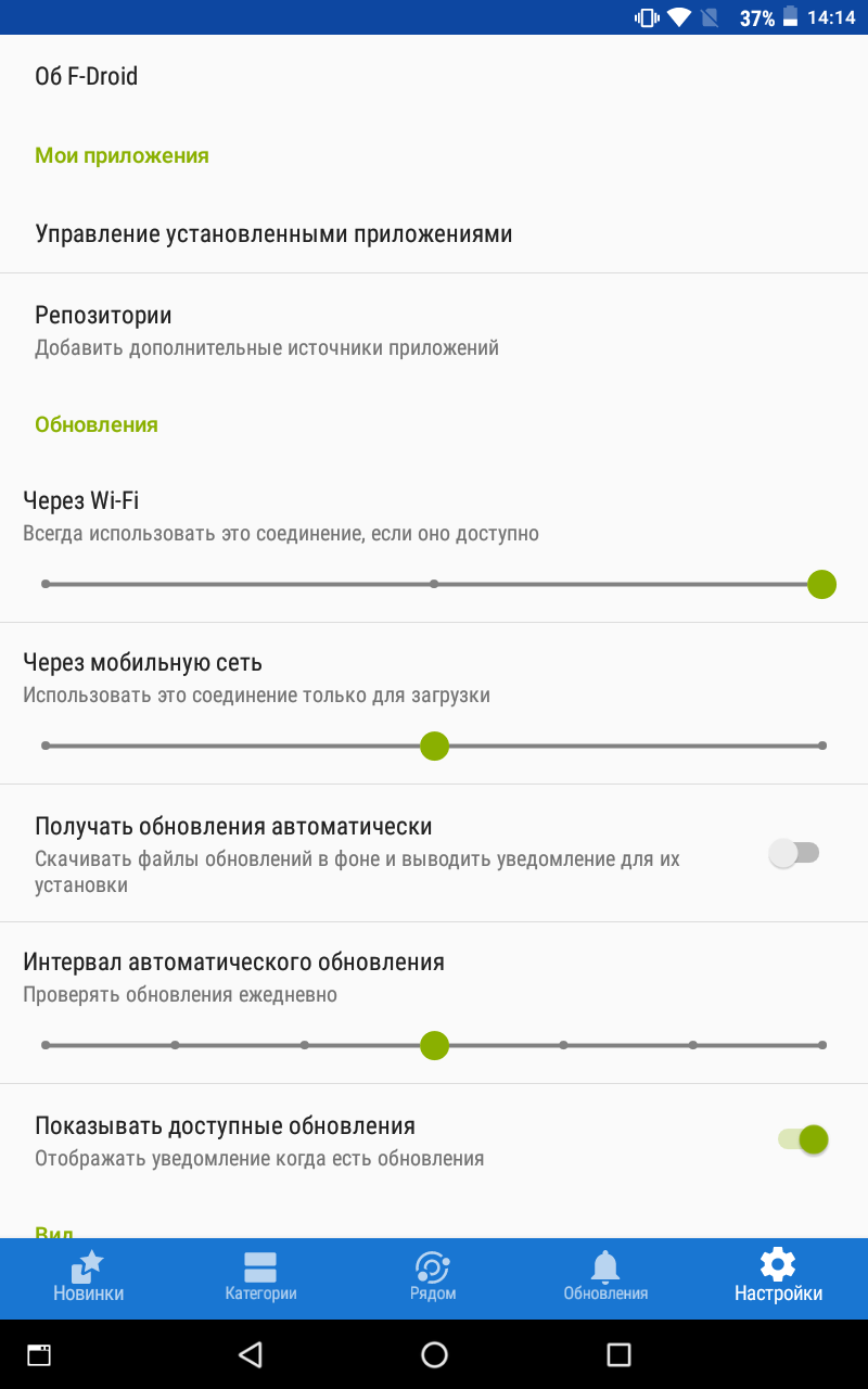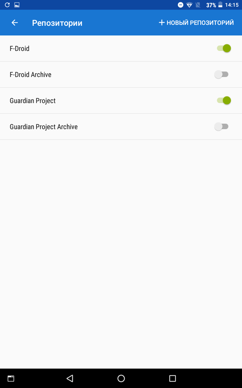 После того как установиться f-droid идем в его настройки, выбираем там репозитории (repositories) и двигаем ползунок Guardia Project, после чего ждем пока репозитории обновятся.