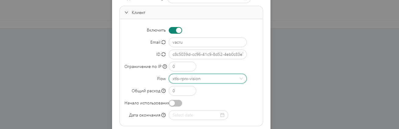 - Flow — Выбираем xtls-rprx-vision.