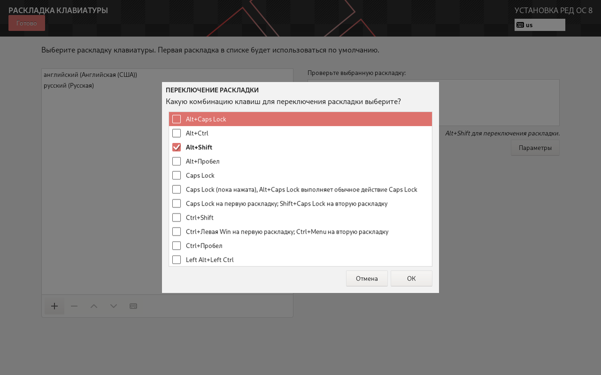 В этом меню мы можем выбрать удобную для себя комбинацию клавиш для смены раскладки клавиатуры.