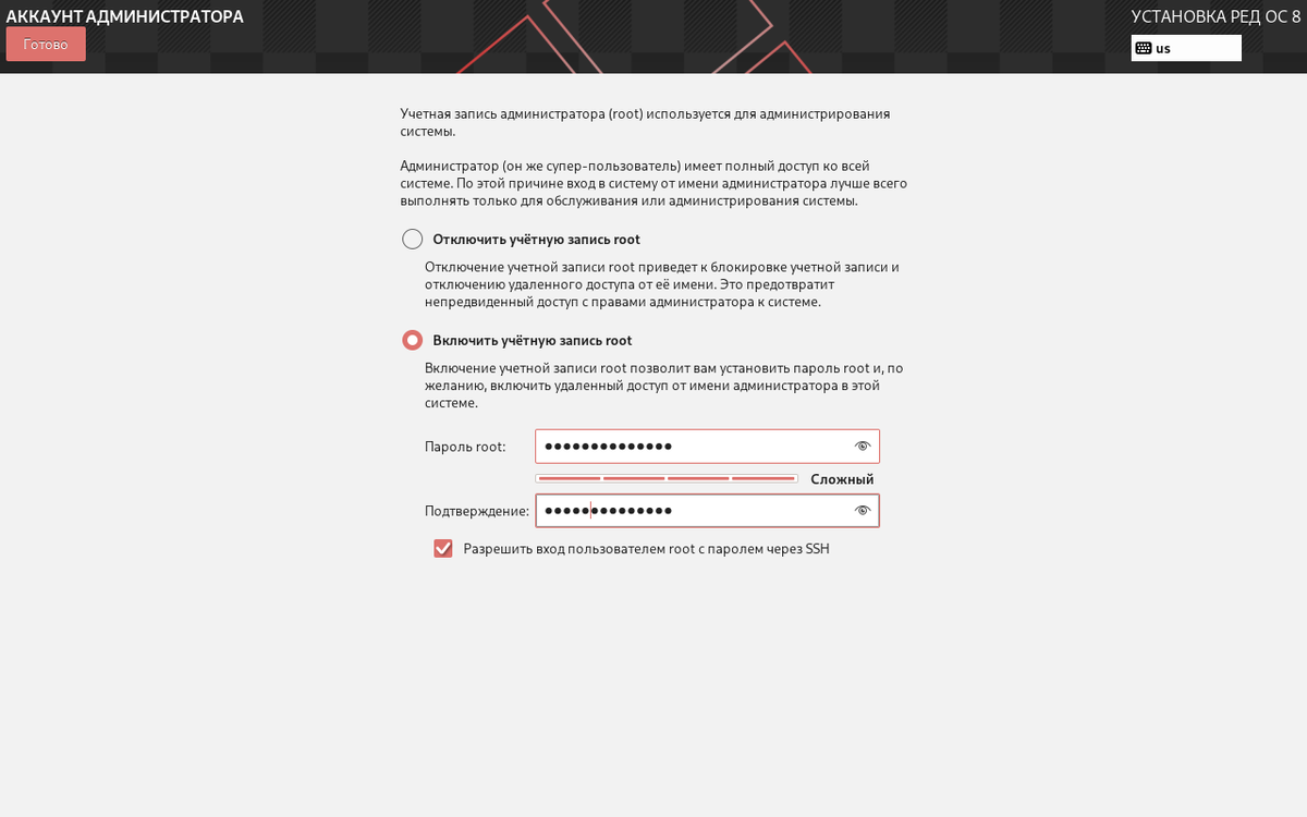 В этой вкладке нам предлагают создать учётную запись администратора - root, у которого будут все права на изменение, добавление и удаление внутри системы. Для этого заходим во вкладку - выбираем "Включить учётную запись root" и дважды вводим придуманный пароль. Галочку "Разрешить вход пользователем root с паролем через SSH" нужно поставить, только если вы будете после установки удалённо подключаться и работать в этой системе.