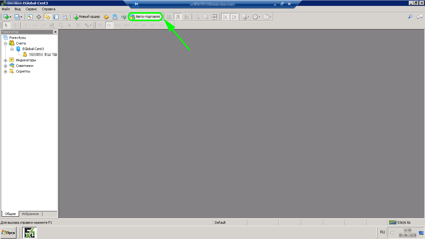 Установку робота на терминал нужно производить при отключенной автоторговле, поэтому находите на панели соответствующую кнопку и нажимаете отключить «Авто-торговлю»