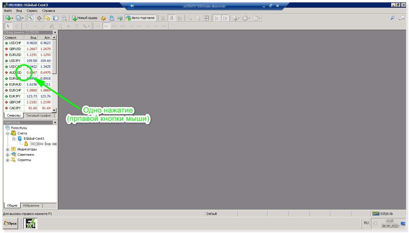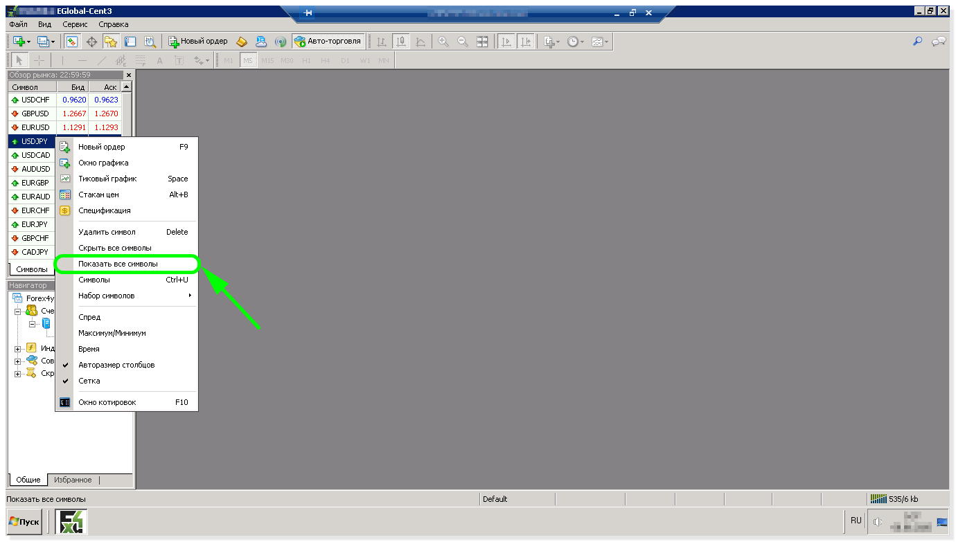 По умолчанию все валютные пары не отображаются в панели выбора валютных пар, поэтому для исключения возможных проблем, на боковой панели «Обзор рынка» в любом месте нажимаете правую кнопку мыши