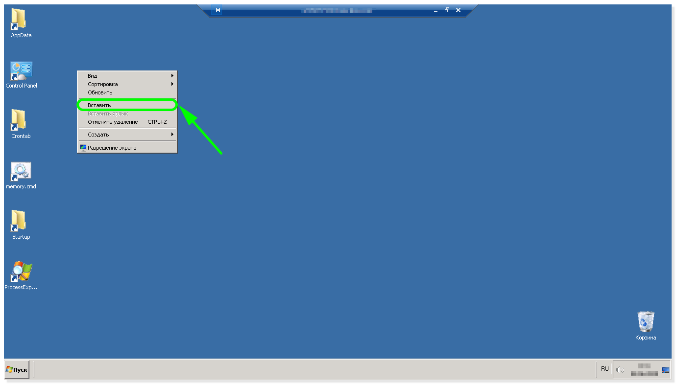 На рабочем столе в свободной области нажимаете правую кнопку мыши, затем в появившемся меню нажимаете «Вставить»