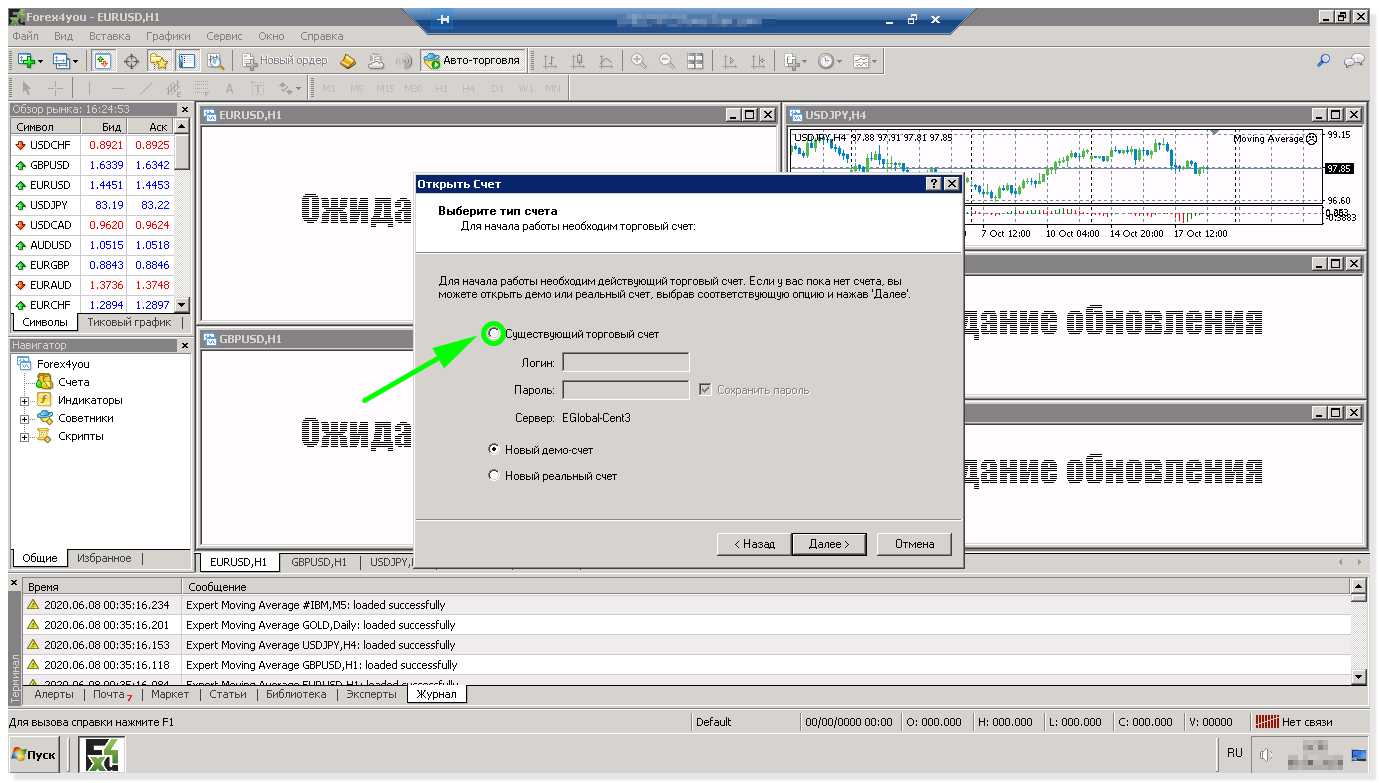 Набираете логин и пароль МТ4 (предоставляется при регистрации на сайте брокера и отправляется на электронную почту) в соответствующие поля