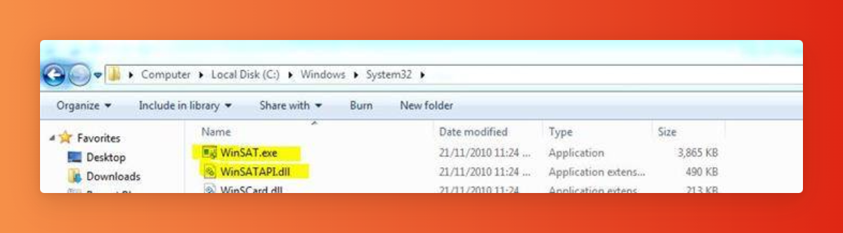 Далее перейти в «System32» и скопировать 2 файла: «WinSATAPI.dll» и «WinSAT.exe»;