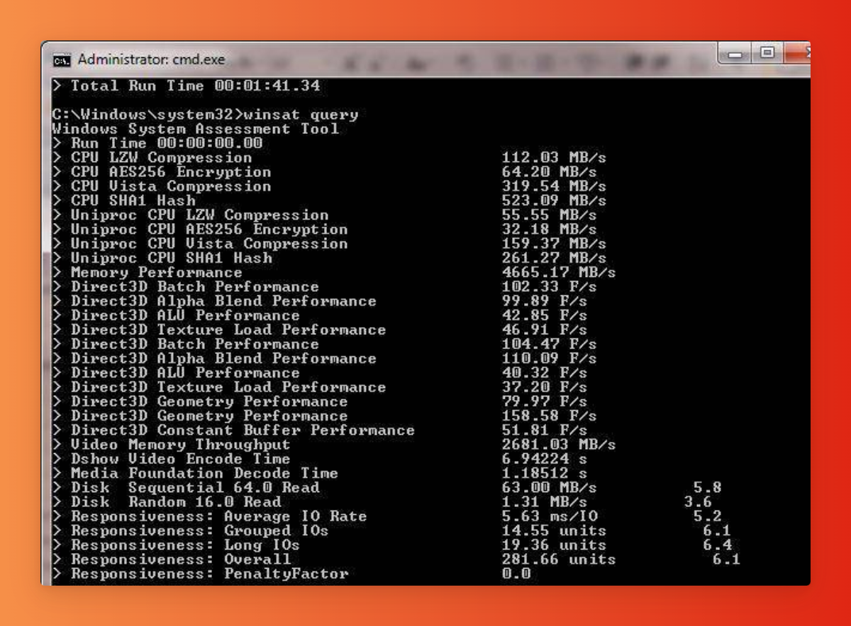 Чтобы произвести общую оценку, то есть выполнить все проверки, следует воспользоваться командой «winsat formal», а для тестирования работы, например, – только жесткого диска: «winsat disk».